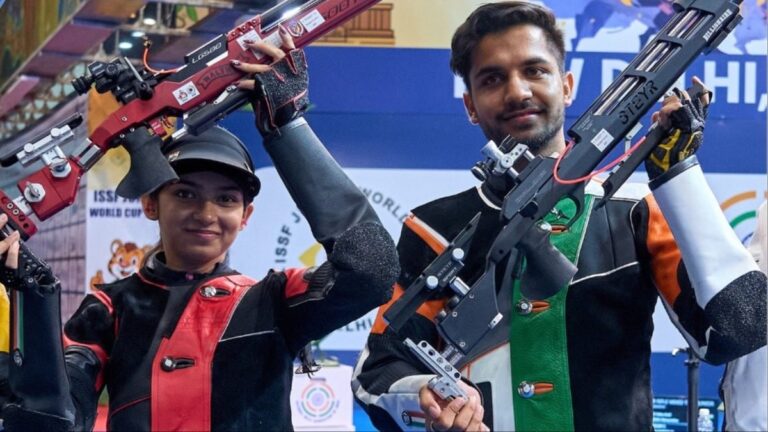 Isha Anil Taksale and Himanshu staged a thrilling comeback to win the 10m air rifle mixed team gold against their compatriots Shambhavi Kshirsagar and Naraen Pranav, while Vinay Pratap Chandrawat bagged bronze in men’s trap as India maintained its No. 1 spot in the ISSF Junior World Cup with 23 medals, on Tuesday.